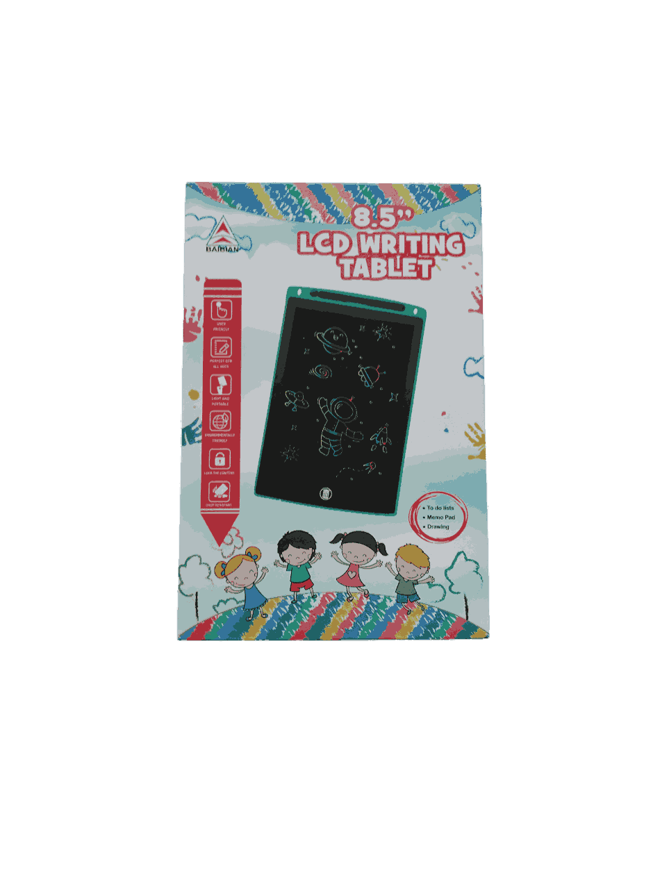 Reusable 8.5 inch LCD Writing Tablet for Kids. Ideal for drawing, handwriting practice, and creative play. Includes stylus and one-touch erase button.