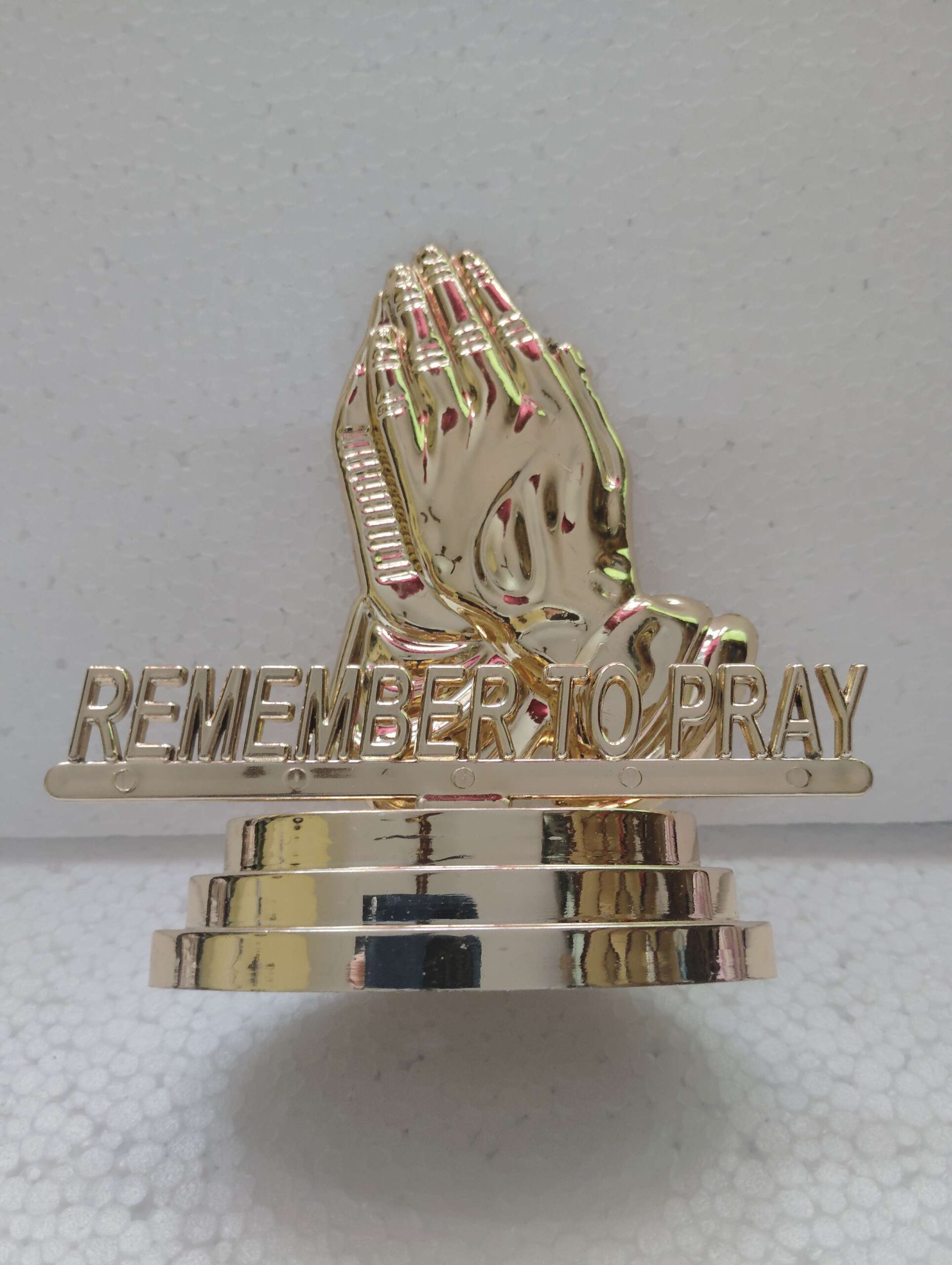 A radium “Remember to Pray” hand stand with glowing finish—perfect reminder to stay spiritually grounded.